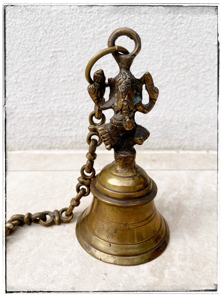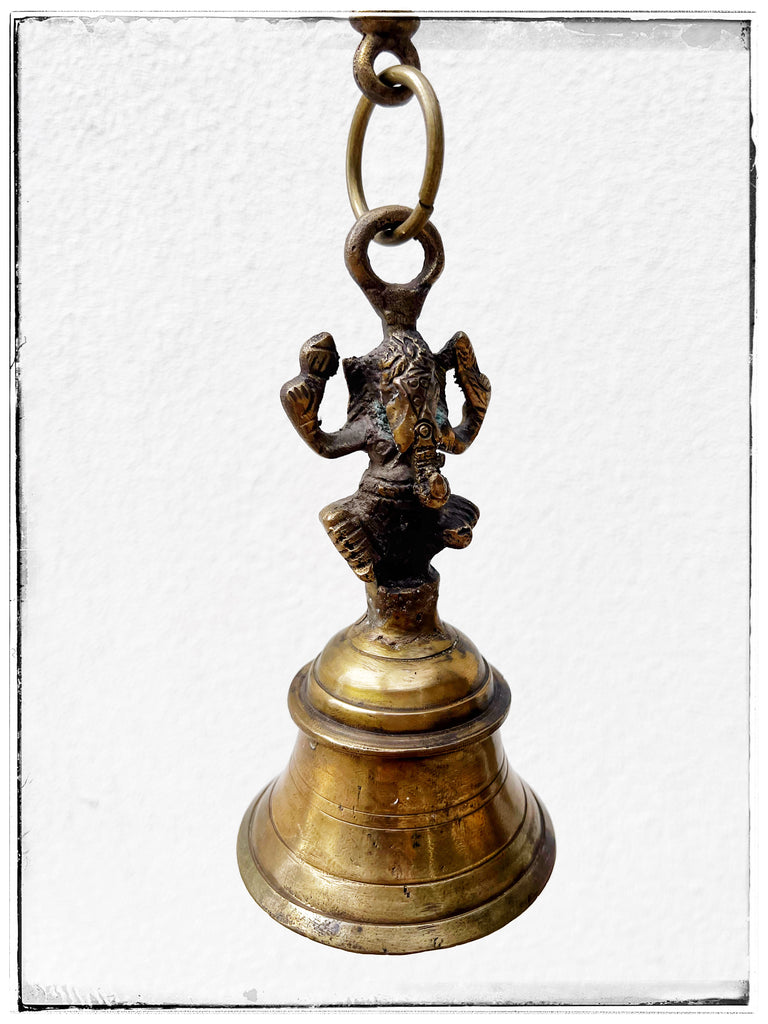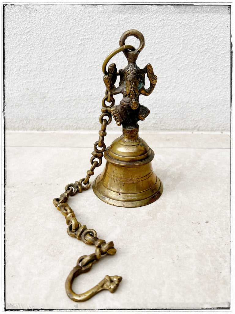 An unusual antique brass, hanging Ganesha bell. Lovely melodic bell, on a beautiful, heavy old chain.